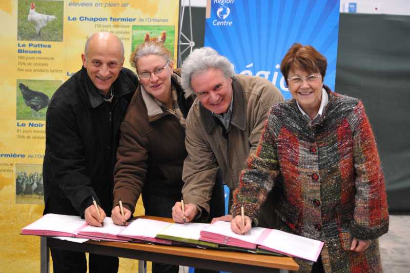 En présence de Mme MIALOT, Vice Présidente du Conseil Régional du Centre et de l'ensemble des représentant de la filière élevage et agricole de la région, les Présidents des 3 interporfessions ont signés aux cotés de la région le CAP'Viande Blanche 2012-2015 2ème génération.